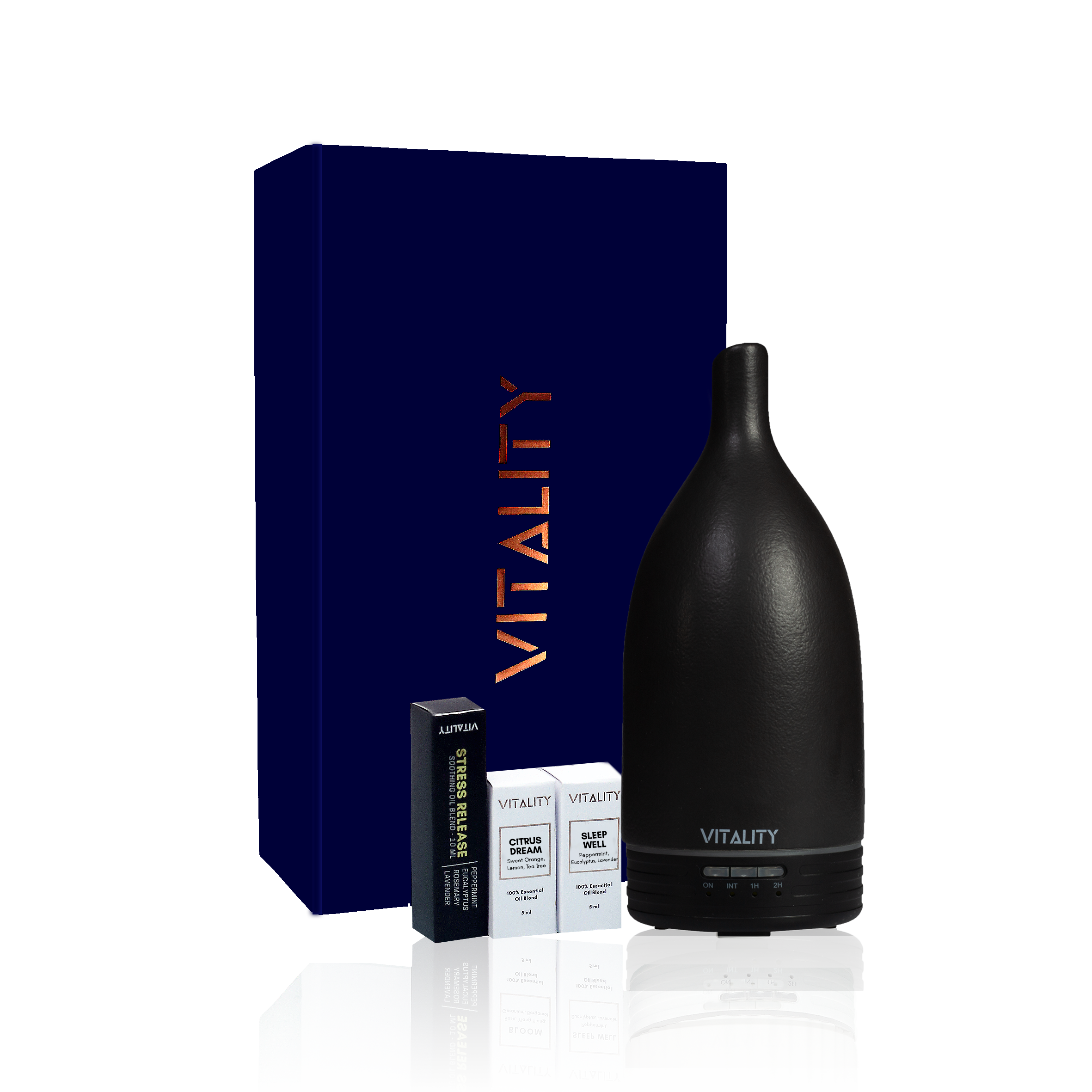 Our limited edition magnetic box includes our classis Aroma Ceramic Black Diffuser, 2 of our best selling oils (Citrus Dream and Sleep Well) and our travel friendly Stress Release roll-on. This diffuser seamlessly blends into your home decor. Gift your loved ones (or yourself) the perfect kit to elevate daily wellness rituals.