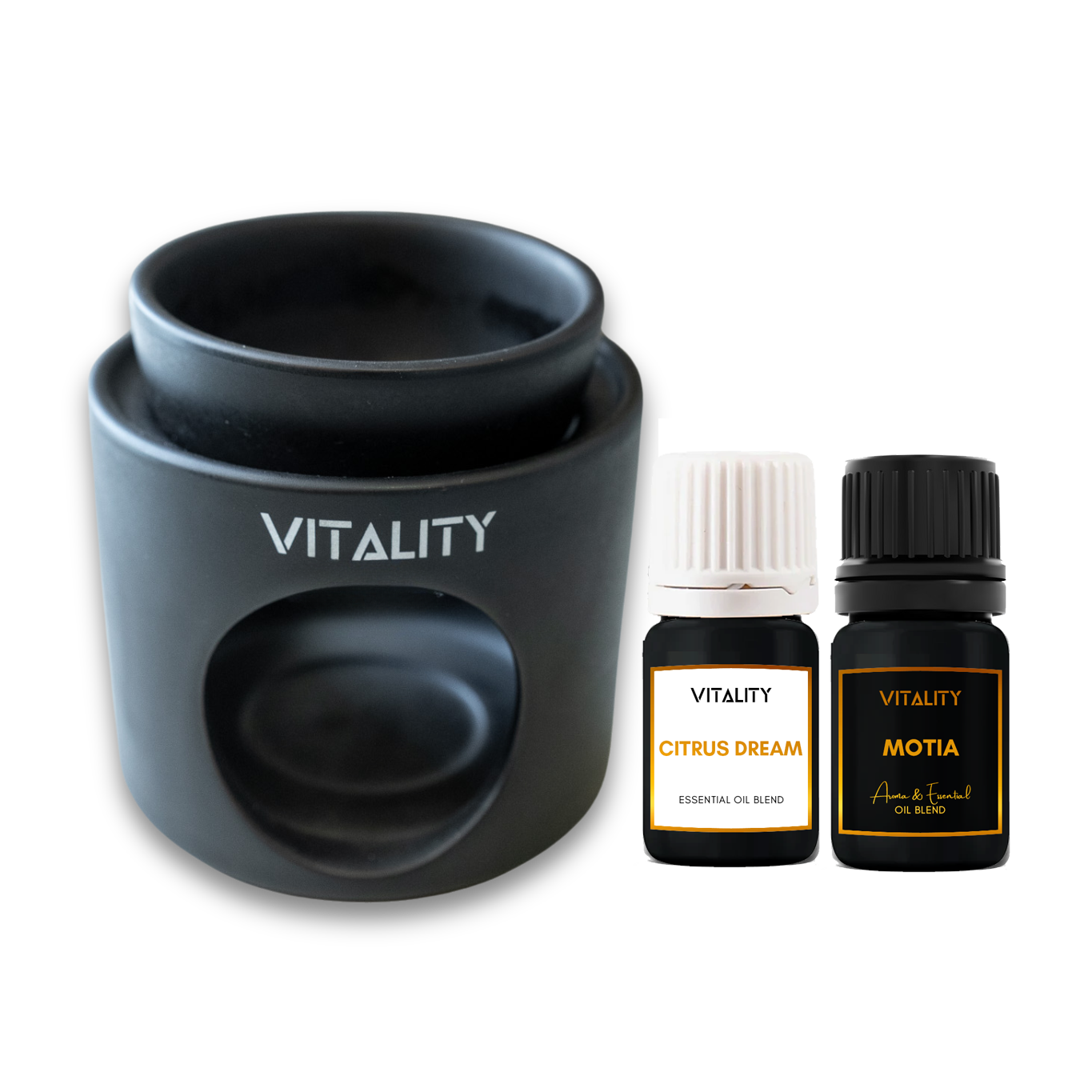 Vitality's Ceramic Oil Burner, a stylish and practical addition to any space, designed to enhance your ambiance and infuse your surroundings with delightful fragrances. Crafted with care from high-quality ceramic material in a black matte hue, this oil burner not only serves as a functional piece but also adds an elegant touch to your decor. With its sleek and minimalist design, our Ceramic Oil Burner effortlessly complements any interior space.