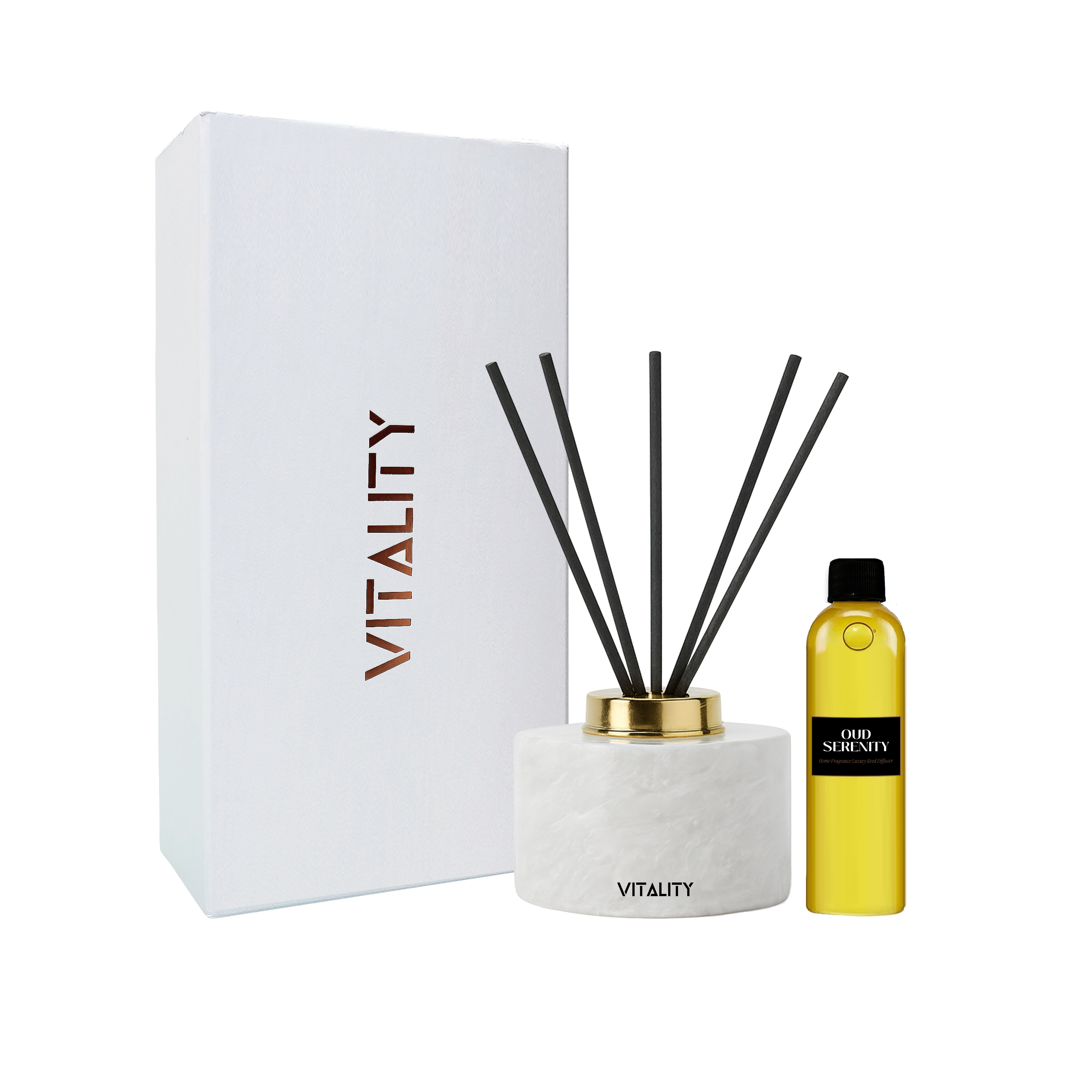 Experience the art of refined living with our Marble Diffuser Gift Set, a harmonious blend of natural stone and metallic craftsmanship. Each diffuser is meticulously carved from solid marble, making every piece unique in pattern and texture. Complemented by hand-polished brass detailing, this set exudes sophistication and balance—perfect for modern interiors or classic décor.