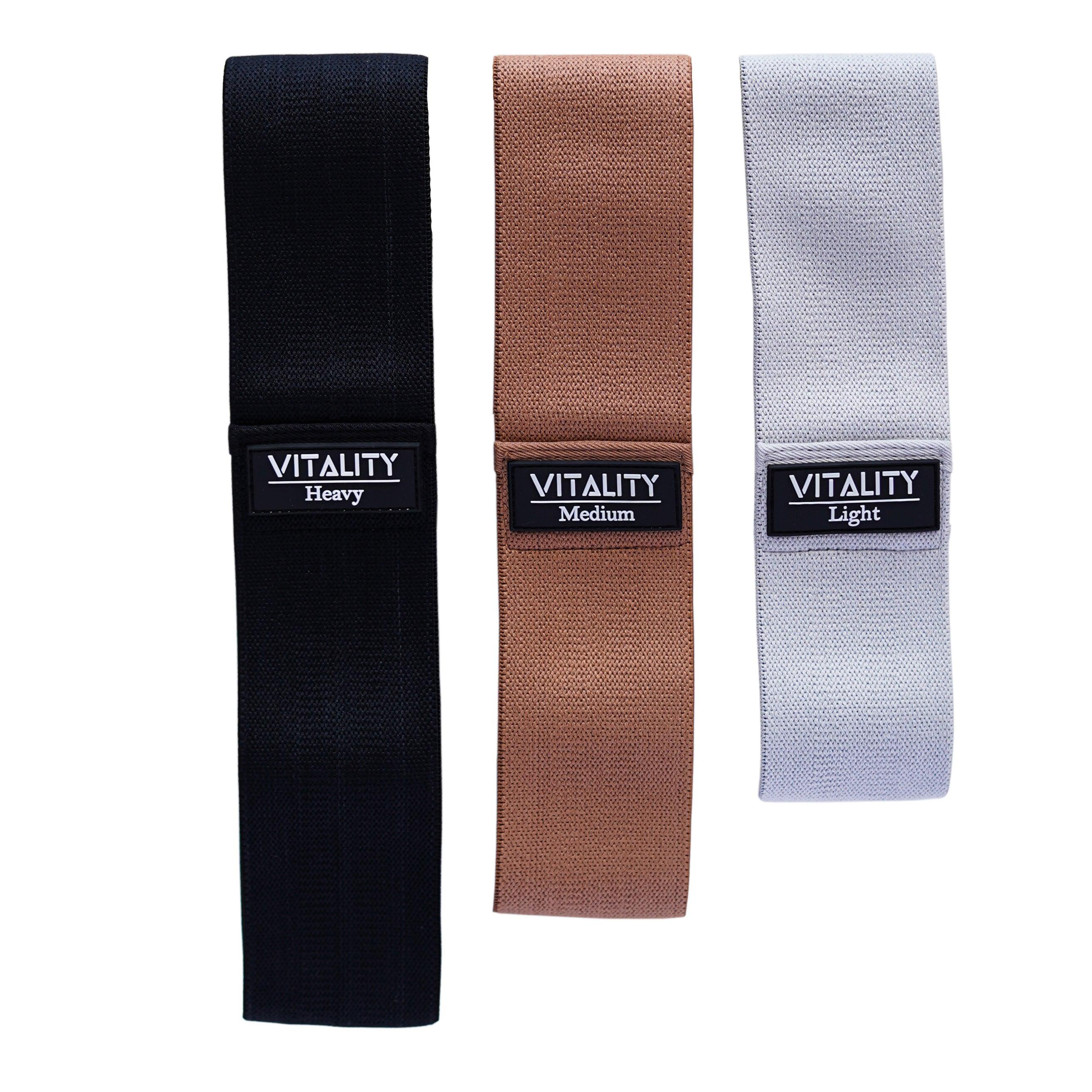 Vitality Glute Bands offer a challenging resistance without all the equipment, making it easy to take your leg training with you anywhere. Elasticated fabric bands are soft on skin and won't pinch or dig in