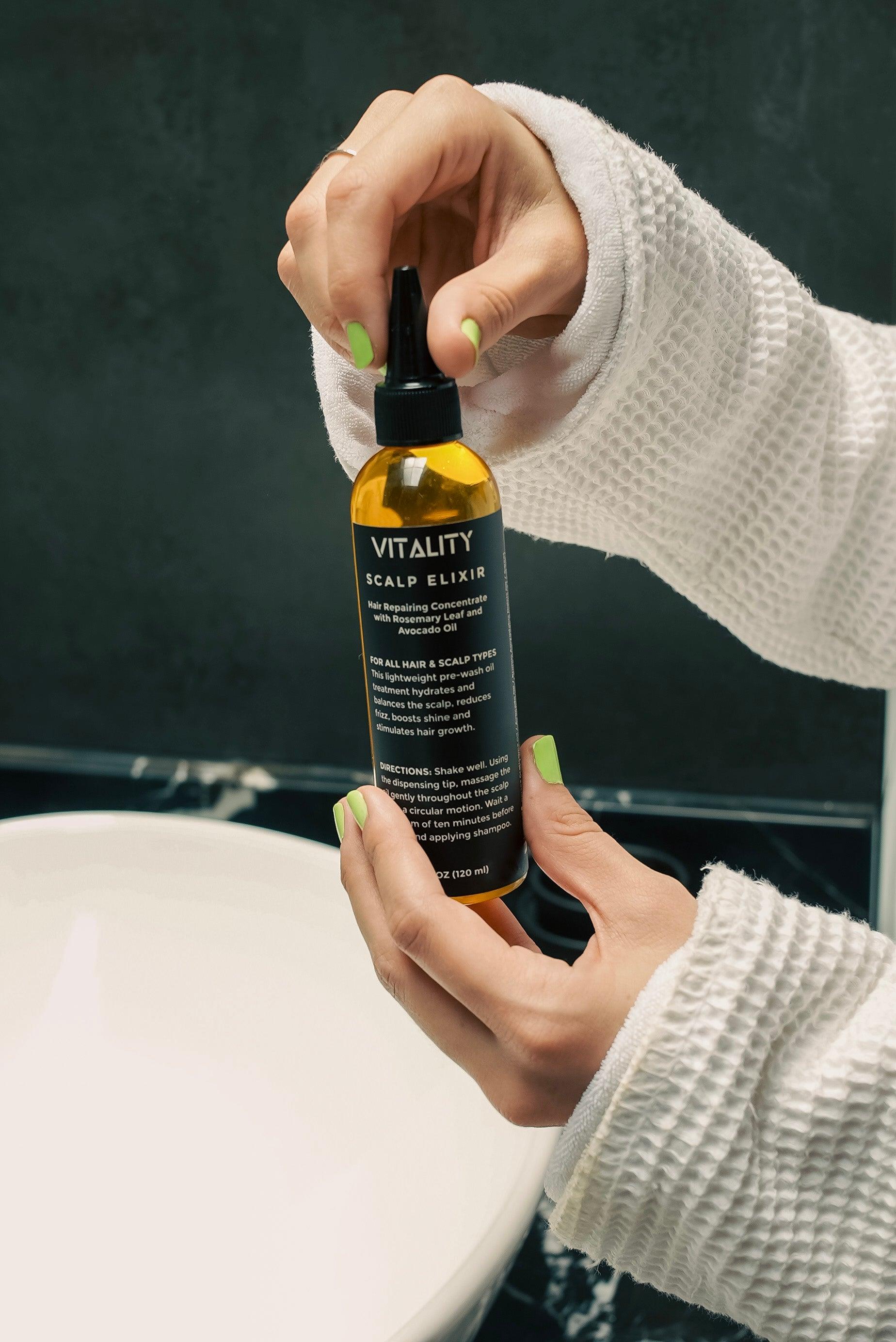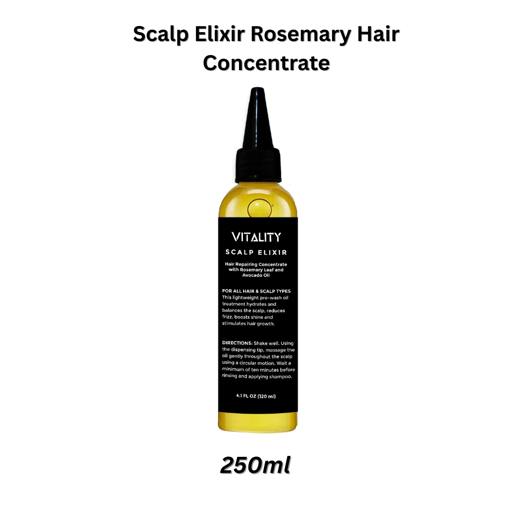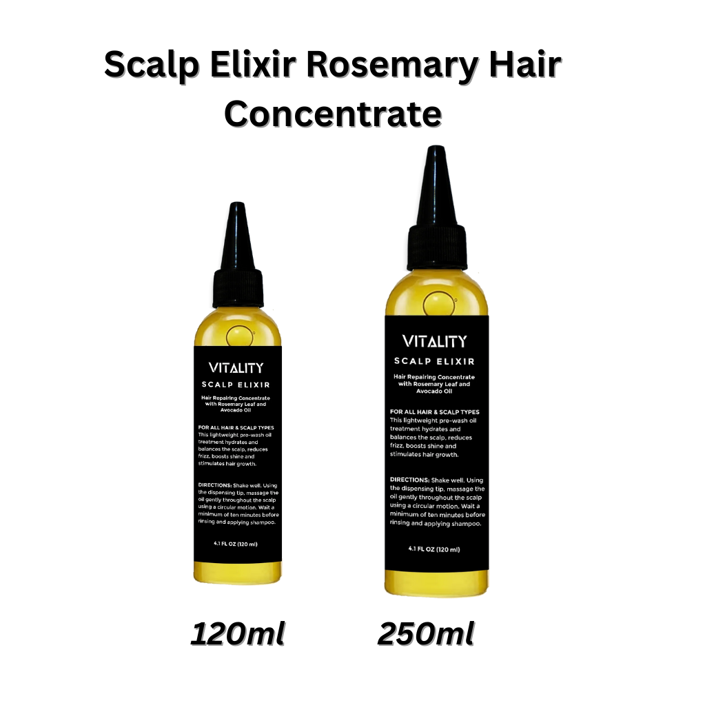 Vitality's Scalp Elixir is infused with Avocado Oil, Rosemary leaf and Peppermint Essential Oil offers a range of benefits for your hair and scalp. Avocado Oil is rich in vitamins and antioxidants, making it an excellent moisturizer that can help nourish and hydrate both the scalp and hair strands. Peppermint Essential Oil has a cooling effect that can help soothe itchiness and irritation on the scalp together. These oils work to moisturize the scalp, enhance hair manageability, and stimulate hair growth. Rosemary Oil, known for its stimulating properties, improves circulation in the scalp, promotes hair growth and overall scalp health.