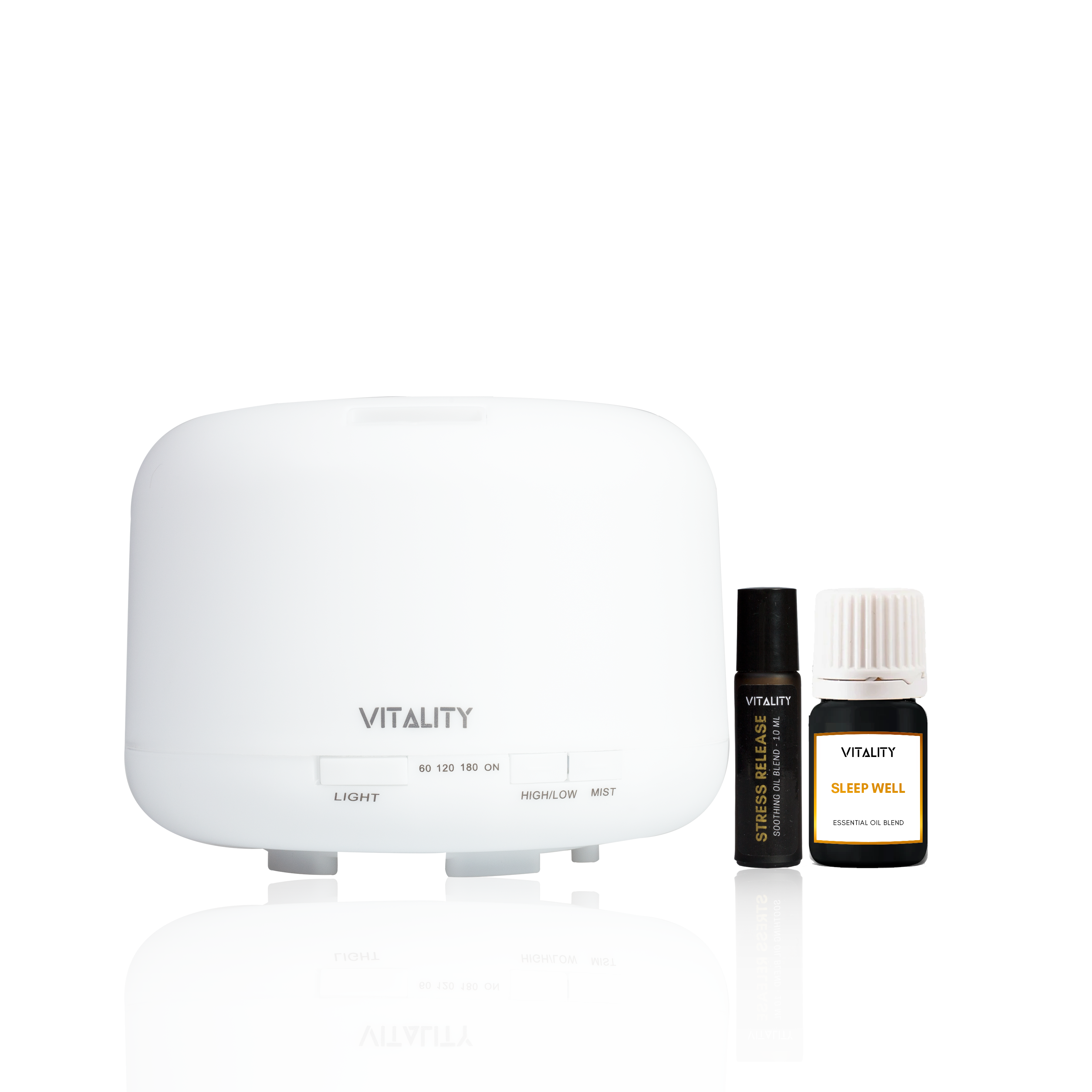 A bundle of Vitality's Aroma Diffuser, Sleep Well Essential Oil Blend (30ml), and fan-favourite Stress Release Roll-on (10ml) to help set the stage for a good night's rest.